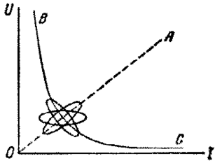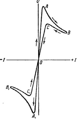 Если на электроды дуги, питаемой постоянным током, на-ложить переменное напряжение амплитуды, меньшей, чем напряжение питающего дугу постоянного тока, то харак-теристика имеет вид замкнутой петли, охватывающей стати-ческую характеристику ВС с двух сторон. При увеличении частоты переменного тока ось этой петли поворачивается, сама петля сплющивается и, наконец, стремится принять вид отрезка прямой ОА, проходящей через начало координат (рис.5). При очень малой частоте петля динамической харак-теристики превращается в отрезок статической характеристики ВС, так как все внутренние параметры разряда,в частности концентрация ионов и электронов, успевают в каждой точке характеристики принимать значения, соответствующие стацио-нарному разряду при данных U и I. Наоборот, при очень быстром изменении и параметры разряда совершенно не успе-вают изменяться, поэтому I оказывается пропорциональным и, что соответствует прямой ОА, проходящей через начало координат.Таким образом, при увеличении частоты переменного тока петля характеристики (рис. 5) становится во всех своих точках возрастающей.