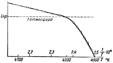 Рис. 6. Изменение температуры угольного анода электрической дкги в воздухе при изменении давления. Шкала по оси ординат логарифмическая.