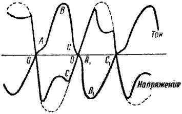 Катод, не успевший ещё охладиться после разряда, имевшего место в предыдущем полупериоде тока, с самого начала полупериода, когда внешняя э.д.с. проходит через нуль, эмиттирует электроны. От точки О до точки А характеристика соответствует несамостоятельному разряду, источником которого являются эмиттируемые катодом электроны. В точке А происходит зажигание дуги. После точки А разрядный ток быстро увеличивается. При наличии сопротивления во внешней цепи напряжение между электродами дуги падает, хотя э.д.с. источника тока (пунктир на рис.3), пробегая синусоиду, ещё увеличивается. С уменьшением напряжения и тока, даваемого внешним источником, разрядный ток начинает уменьшаться.