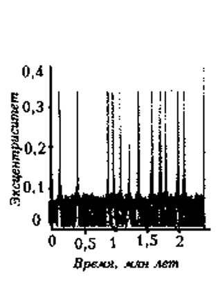 На рисунке 7 изображены результаты численного моделирования эволюции орбиты астероида, отвечающей резонансу 1:3. Они демонстрируют, что на протяжении миллионов лет возникают сильные прерывистые всплески значений эксцентриситета орбиты. В период такого всплеска астероид может пересечь орбиту Марса и под влиянием тяготения этой планеты оказаться выброшенным из устойчивой зоны, превратившись в астероид-бродягу. Благодаря этому возможно образование лакун в распределении орбит астероидов.