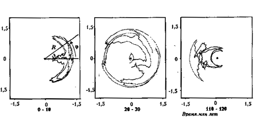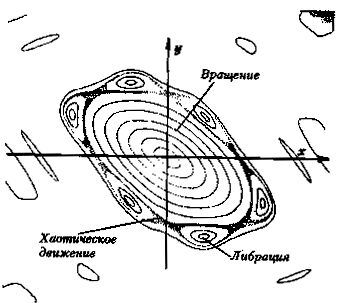 Сечение Пуанкаре траектории Гипериона, рассчитанное на ЭВМ, соответствует стационарной орбите, возникающей в результате резонанса движений двух спутников Сатурна – Титана и Гипериона (резонансом в данном случае является такое движение спутников вокруг планеты, когда время обращения одного кратно времени обращения другого). Однако, если начальные условия совсем немного отличаются от тех, которые соответствуют этой орбите, траектории попадают в зону неустойчивости. Тело, помещенное на неустойчивую орбиту, будет рано или поздно выброшено из системы Сатурн – Титан – Гиперион при сближении с Титаном. Итак, теперь можно дать объяснение бесформенности Гипериона. За время своего существования Гиперион испытал многократные столкновения со сравнительно небольшими телами, обильно населяющими окрестности Сатурна. Куски Гипериона, которые были отколоты в результате таких ударов, собрались вокруг него под действием сил гравитации в гигантское облако. Однако благодаря наличию зоны неустойчивости вблизи орбиты Гипериона, эти осколки не упали обратно на Гиперион, а были постепенно (за время, много меньшее времени жизни самого Гипериона) выброшены из системы Сатурн – Титан – Гиперион в окружающее пространство.