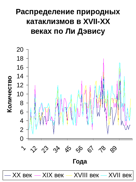 Однако простой количественный анализ трагических событий, проведенный крупным знатоком истории катастроф Ли Дэвисом, выявил некоторую «последовательность случайностей» (см. диаграмму). Она напоминает кардиограмму, на которой «сердцебиение» катастроф очень странно совпало в веках. Последняя треть каждого столетия действительно чревата всплесками, но в то же время на рубеже веков – в самом конце и в самом начале – никакого пика катастроф, «готовящих» конец света, нет.