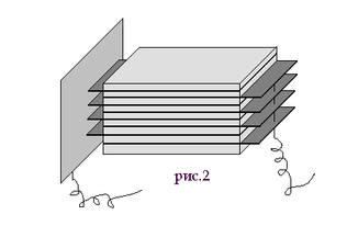 В этом патенте для нас наибольший интерес представляют «конденсаторы особых типов» в виде стопки (блока) металлических пластин (или полосок фольги) с находящимися между ними изоляционными слоями (пластинами), при этом четные металлические пластины (полоски фольги) соединены между собой общим проводником, а нечетные другим (рис. 2). П.Н.Яблочков указывает, что такие блоки можно соединять друг с другом параллельно или последовательно. Блочная (пакетная) конструкция, предложенная им, впоследствии нашла широкое применение.