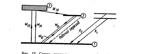 С уровня 3 часть возбужденных атомов хрома снова возвращается на основной уровень 1, а часть переходит на уровень 2. Это так называемый безызлучательный переход, при котором ионы хрома отдают часть своей энергии кристаллической решетке в виде тепла. Вероятность перехода с уровня 3 на уровень 2 в 200 раз больше, а с уровня 2 на уровень 1 в 300 раз меньше, чем с уровня 3 на уровень 1. Это приводит к тому, что уровень 2 оказывается более заселенным, чем уровень 1. Иными словами, заселенность получается инверсной и создаются необходимые условия для интенсивных индуцированных переходов.