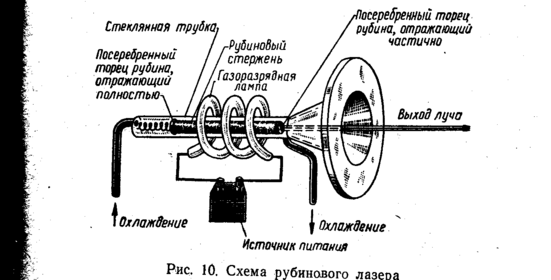 Лазер состоит из трех основных частей: активного (рабочего) вещества, резонансной системы, представляющей две параллельные пластины с нанесенными на них отражающими покрытиями, и системы возбуждения (накачки), в качестве которой обычно используется ксеноновая лампа-вспышка с источником питания (рис. 1).