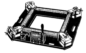 Основными частями этого пермеаметра являются массивная рама 1 из мягкой стали с высокой магнитной проницаемостью и две обмотки w1 и w2. Через боковые отверстия в раму вводится испытуемый образец Р, плотно зажимаемый при помощи специальных конических втулок. Обмотка w1 является намагничивающей, обмотка w2 служит для включения баллистического гальванометра. Переключатель 2 позволяет включать и изменять направление тока в намагничивающей обмотке. Порядок определения магнитного потока в испытуемом образце остается таким же, как и при испытании кольцевой пробы. Некоторое затруднение возникает с вычислением напряженности магнитного поля Н. Вычисление ее по формуле