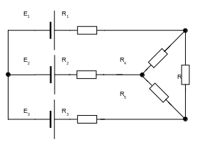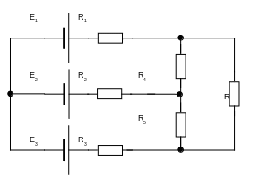 R1=1Ом; R2=0,5Ом; R3=0,4Ом; R4=R5=R6=3Ом