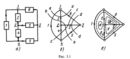 Числа узлов и ветвей графа обозначим пy и nд. Поскольку каждому узлу и каждой ветви цепи сопоставляется узел и ветвь графа, граф цепи содержит всю информацию о соединениях и геометрических свойствах исходной цепи. На рис. 3.1, а, б соответственные узлы, а также ветви цепи и графа имеют одинаковые номера.
