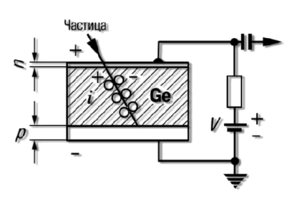 етектор. Схематическое изображение полупроводникового детектора (штриховкой выделена чувствительная область): n - полупроводник с электронной проводимостью; p - полупроводник с дырочной проводимостью; Ge - германий, имеющий собственную проводимость(i); V - напряжение постоянного источника.