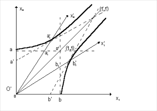 Но преобразования (p) тождественны преобразованиям перехода от декартовых координат к косоугольным. При этих преобразованиях времениподобные векторы, т.е. векторы, направленные из начала отсчета в точки, лежащие выше линии OO', в любой системе координат также останутся времениподобными, т.к. концы векторов лежат на гиперболах. Следовательно, и пространственноподобные векторы во всех системах координат останутся пространственноподобными.