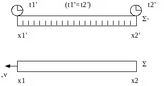 , т.е. концы нижнего масштаба засекаются не в один и тот же момент времени по часам, помещенным в системеS, но в один и тот же момент по часам, находящимся в системе