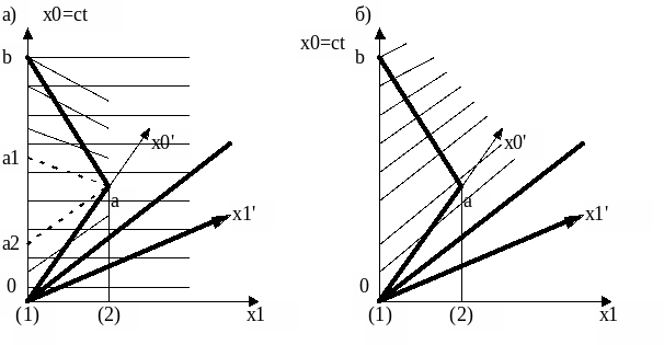 Точки на ломаной 0ab отмечают равные единичные промежутки времени, измеряемые часами В, находящимися в системе