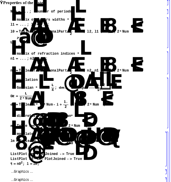Здесь задаются свойства системы: число периодов решетки, базовые толщины слоев (от этих значений потом строится матрица слоев), показатели преломлений сред. Потом задается распределение Гаусса с последующей дискретизацией, ибо компьютер не умеет обращаться с непрерывными функциями. В случае не гауссовой модуляции вместо распределения Гаусса следует вводить требуемую функцию распределения значений толщин слоев.