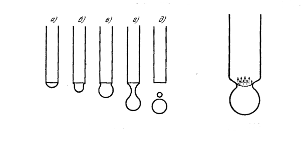 Измерив вес Р оторвавшейся капли и радиус шейки в момент отрыва, можно вычислить коэффициент поверхностного натяжения жидкости. Для достижения необходимой точности в определении радиуса шейки отрывающуюся каплю проектируют с известным увеличением на экран, где и производится измерение диаметра. При грубых измерениях диаметр шейки принимают примерно равным диаметру отверстия. Вес Р отрывающейся капли измеряется на аналитических весах. Обычно в целях повышения точности измерения отсчитывают определенное число капель и измеряют их общий вес.Описанный способ экспериментального определения коэффициента поверхностного натяжения дает хорошие результаты, несмотря на то, что в действительности отрыв капли происходит не совсем так, как описано выше. На самом деле капля не отрывается по линии окружности шейки. В момент, когда размер капли достигает значения, определяемого равенством (5), шейка начинает быстро сужаться, как это показано на рис. 5,г, причем ей сопутствует еще одна маленькая капля, как это показано на рис. 5,д.