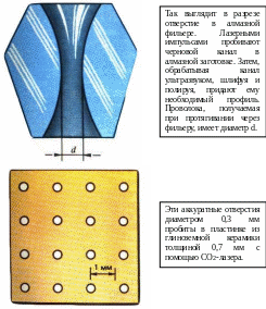 Вскоре после своего появления на свет лазер получил следующее задание, с которым справился столь же успешно, — сверление (пробивание) отверстий в алмазных фильерах. Для получения очень тонкой проволоки из меди, бронзы, вольфрама используется технология протягивания металла сквозь отверстие соответствующего диаметра. Такие отверстия высверливают в материалах, обладающих особо высокой твердостью, — ведь в процессе протягивания проволоки диаметр отверстия должен сохраняться неизменным. Наиболее тверд, как известно, алмаз. Поэтому лучше всего протягивать тонкую проволоку сквозь отверстие в алмазе — сквозь так называемые алмазные фильеры. Лишь с помощью алмазных фильер удается получать сверхтонкую проволоку, имеющую диаметр всего 10 мкм. Но как просверлить тонкое отверстие в таком сверхтвердом материале, как алмаз? Механически это сделать очень трудно — для механического сверления одного отверстия в алмазной фильере требуется до десяти часов. Зато, как оказалось, совсем нетрудно пробить это отверстие серией из нескольких мощных лазерных импульсов.