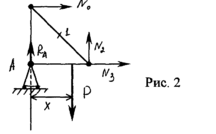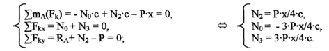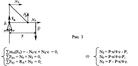 Проведем сечение конструкции так, как указано на рис.1, и рассмотрим равновесие левой части фермы (рис.2), заменяя действие на нее правой части силами, направленными вдоль стержней (соответственно N0, N2, N3) . Составим условия равновесия, учитывая, что нагрузка движется слева направо, а "х" есть изменение расстояние от опоры до узла, в котором приложена сила. Найдем усилия в стержнях для случая, когда 0с