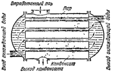 Отработанный пар проходит мимо труб, по которым протекает холодная вода. Пар конденсируется. Получившийся конденсат отсасывается от конденсатора по трубе, показанной снизу. В конденсаторах давление пара обычно значительно ниже атмосферного (0,02—0,03 атм). Воду, получившуюся из пара (конденсат), и воздух, проникший вместе с ней, откачивают из конденсатора особым насосом.