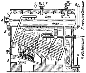 Паровой котел. Он состоит из топки и собственно котла. Уголь или дрова сжигаются в топке на колосниковых решетках. Жидкое топливо сжигается в распыленном состоянии; распыление обычно производится с помощью пара в форсунках. Пар или сжатый воздух, вырываясь из узкого отверстия в трубке, засасывает жидкое топливо и разбрызгивает его.