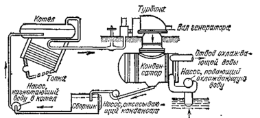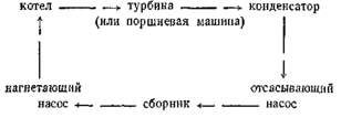 Она превращается в пар в котле, пар производит работу в турбине (или в поршневой машине) и снова превращается в воду в барабане, охлаждаемом проточной водой (конденсатор). Из конденсатора получившаяся вода посредством насоса через сборный, бак (сборник) снова направляется в котел. Итак, круговорот воды происходит по следующей схеме: