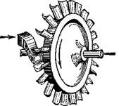 аровая турбина. Из котла пар по паропроводу поступает в турбину или в поршневую машину. Рассмотрим сначала турбину (а). Турбина состоит из стального цилиндра, внутри которого находится вал ее с укрепленными на нем рабочими колесами. На рабочих колесах находятся особые изогнутые лопатки (б и с), где изображено одно из рабочих колес с соплом). Между рабочими колесами помещаются сопла или направляющие лопатки. Пар, вырываясь из промежутков между направляющими лопатками, попадает на лопатки рабочего колеса. Рабочее колесо при этом вращается, производя работу. Причиной вращения колеса в паровой турбине является реакция струи пара. Внутри турбины пар расширяется и охлаждается. Входя в турбину по узкому паропроводу, он выходит из нее по очень широкой трубе (а). Отметим, что турбина может вращаться только в одном направлении и скорость вращения ее не может меняться в широких пределах. Это затрудняет применение паровых турбин на транспорте, но очень удобно для вращения электрических генераторов. а