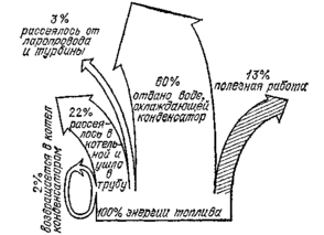 оэффициент полезного действия паросиловой станции. Энергетический баланс паросиловой станции с турбиной показан на рисунке. Он является примерным; к. п. д. паросиловой станции может быть и больше (до 27 %). Потери энергии, которые имеют место при работе паросиловой станции, можно разделить на две части. Часть потерь обусловлена несовершенством конструкции и может быть уменьшена без изменения температуры в котле и в конденсаторе. Например, устроив более совершенную тепловую изоляцию котла, можно уменьшить потери теплоты в котельной. Вторая, значительно большая часть — потеря теплоты, переданной воде, охлаждающей конденсатор, оказывается при заданных температурах в котле и в конденсаторе совершенно неизбежной. Как было отмечено ранее, условием работы теплового двигателя является не только получение некоторого количества теплоты от нагревателя, но и передача части этой теплоты холодильнику.