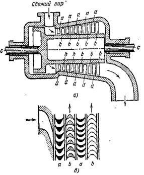 б) Расположение на валу ее турбины лопаток: а — направляющих, b — рабочих