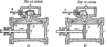 стройство цилиндра и золотниковой коробки паровой машины а) Пар входит в цилиндр слева б) Пар входит в цилиндр справа