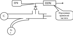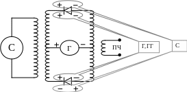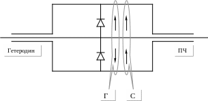 ГГ – гармоніка гетеродина. На двох діодах сигнал має різні полярності. Струм проміжної частоти залежить від фази на діоді. Отже струм від гетеродина буде в один бік, і на котушці приймача перетвориться в нуль. Сигнал струму буде фіксуватися окремо.