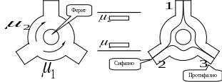У циркуляторі з феритом хвиля в одному напрямку буде взаємодіяти з феритом сильніше, ніж у протилежному (як і в хвилеводі – див. Мал.). Відповідно і довжина хвилі, що обертається за часовою стрілкою, буде