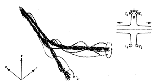 Остановимся подробнее на одной области приложений, которая уже приобретает реальную жизнь, - на проблеме вихревой безопасности полетов. Образование аэродинамической подъемной силы всегда сопровождается возникновением и сходом в поток свободных вихрей. Они превращаются в устойчивые вихревые жгуты, которые тянутся за тяжелыми самолетами 10-15 км (рис. 5). По сути дела, это еще один тип когерентных вихревых структур, очень мощных и опасных: попадание в них других ЛА чревато аварией или даже катастрофой.