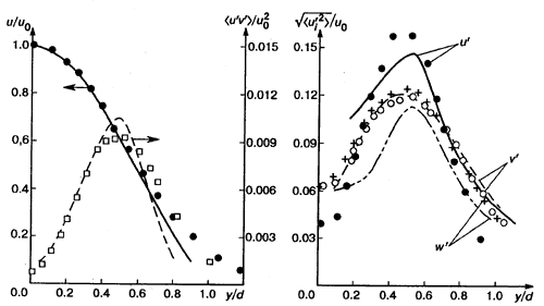 /u0 (здесь u1'=u',u2'=v',u3'=w') и рейнольдсовых напряжений сдвига u'v'/u02.