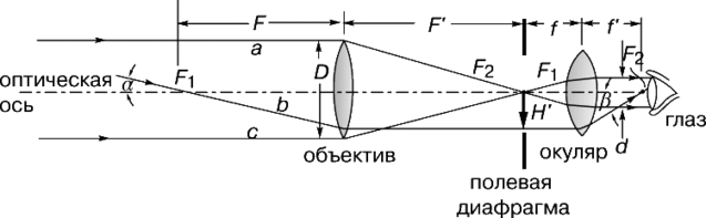 Может быть дополнительная лупа, которая позволяет приблизить глаз к фокальной плоскости и рассматривать изображение с меньшего расстояния, т. е. под большим углом зрения.
