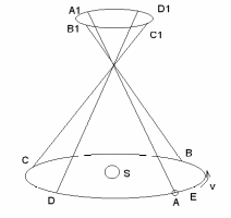 Пусть прямая CA - путь луча света, идущего от источника C, по которому движется световая корпускула. Пусть глаз наблюдателя движется вдоль прямой BA со скоростью v, которая относится к скорости света c, как BA относится к CA. Корпускула света, которая обеспечивает видение глазом источника C в точке A, должна была быть испущена источником C в тот момент, когда глаз находился в точке B.