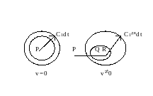 В случае наличия в среде эфирного ветра элементарные волны тоже являются бесконечно малыми сферическими поверхностями, но эти поверхности теперь непрерывно сносятся движением эфира, и поэтому центры их в момент времени t+dt располагаются не в точках P испускания волн, а в бесконечно мало сдвинутых точках Q, которые находятся на бесконечно малых, прямолинейных отрезках PR, вдоль точки P эфира перемещаются при его движении за интервал времени t, t+dt. Отрезок PR имеет длину v·dt, где v - скорость эфира в точке P и он направлен вдоль вектора скорости v эфирного ветра в этой точке P. Радиусы сфер элементарных волн, однако, все равно равны c1·dt, как в неподвижной среде, см. рис.