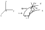Одновременно с построением положения последующего фронта волны мы узнаем и дальнейший ход всех лучей. Прямой отрезок, проведенный из точки P на поверхности P, являющестя центром испускания элементарной волны, в точку P1, расположенную на поверхности S1 и являющуюся точкой касания этой элементарной волной огибающей поверхности S, является элементом луча. Один из элементов луча изображен отрезком PP1 на рисунке.