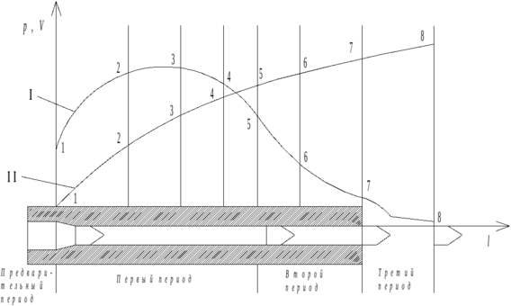 Рассмотрим, как происходит процесс выстрела. Его длительность можно условно разделить на такие последовательные периоды: предварительный от начала горения порохового заряда до полного врезания оболочки пули в нарезы ствола; первый от начала движения пули по стволу до полного сгорания порохового заряда; второй от момента полного сгорания порохового заряда до момента вылета пули из ствола; третий от момента вылета пули до прекращения возрастания её скорости.