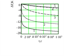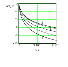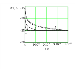 | Рис.1. Зависимость величины баротермического эффекта от времени при различных барических сжимаемостях. Обозначения: 1 - = 3 10-4 Па-1, 2 – 10-5, 3 – 10-6, 4 – 10-7, 5 – 5 10-8 |
