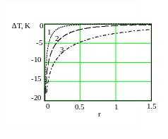 На рис. 4 показана зависимость баротермического эффекта от времени на различных расстояниях от оси скважины. Из рисунка видно, что величина температурного эффекта возрастает со временем тем больше, чем меньше радиус скважины. В расчетах принято: ε=-0.5∙10-5