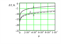 На рис. 2 показана зависимость баротермического эффекта от времени при различных относительных вязкостях. Из рисунка видно, что величина температурного эффекта возрастает со временем тем больше, чем меньше относительная вязкость. В расчетах принято: ε=-0.5∙10-5
