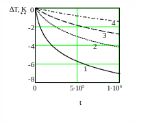 На рис. 3. показана зависимость баротермического эффекта от времени при различных относительных проницаемостях. Из рисунка видно, что величина температурного эффекта возрастает со временем тем больше, чем больше относительная проницаемость. В расчетах принято: ε=-0.5∙10-5