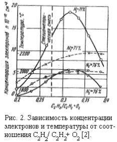 Концентрацию электронов определяли методом сопротивления фронта пламени. Некоторые результаты работы даны на рис.2, где концентрация электронов и температура пламени даны в функции соотношения С2Н2/С2Н2+О2 при двух концентрациях азота (71 и 76%). Концентрация электронов по рассмотренным режимам менялась в пределах 1010 - 1011 см-3, причем ее максимальное значение соответствовало максимальной скорости горения.