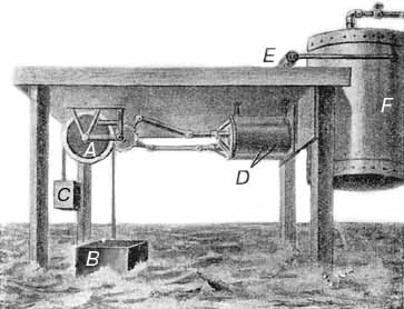 Ещё в начале XX века американский инженер Рансом сконструировал установку, использующую энергию волн для сжатия воздуха. Схема его установки показана на рисунке.