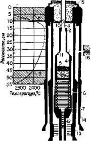 Справа от средней части рабочей зоны показан «горячий» конец смотрового канала 16 (диаметр 6 мм, длина 45 см) для контроля температуры нагревателя. Печь нагревается до 2400° С за 16 час, снижение тока до нуля после окончания опыта производится в течение 6 час.