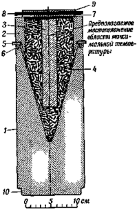Чтобы определить положение изотерм 8 и 9, одна сторона конического тигля 3 была сфрезерована, а внутрь стакана-питателя на том уровне, где в стенке имеется небольшой уступ, был помещен графитовый диск диаметром 9 см и толщиной 2 мм. Эго позволяет проводить одновременные измерения температуры (через окошечко в верхней части печи) на конце конического тигля и на диске внутри стакана-питателя. Отношение внутреннего диаметра стакана-питателя к внутреннему диаметру тигля 3 должно быть достаточно большим по следующим причинам: а) карбид кремния в тигле 3 представляет собой плотный кристаллический осадок, а в питателе — рыхлые куски; б) большая часть карбида кремния, испаряющегося в зоне изотермы 9 в питателе, будет осаждаться обратно ниже уровня 9, что будет приводить лишь к уплотнению загрузки 5, а не к росту осадка 10; в) часть паров теряется через зазор 11 между стаканом-питателем и сублимационной бутылкой, уходит в область радиационных экранов.