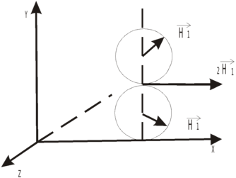 Если соответствует частоте резонанса, магнитный диполь поглощает энергию поля, создаваемого катушкой, вследствие чего вектор магнитного момента отклоняется в направлении к плоскости ху и во второй (приемной) катушке, расположенной вдоль оси у, наводится э.д.с.
