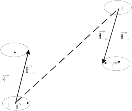 осц. Эта компонента создает магнитное поле, которое может индуцировать переходы соседнего ядра, если это ядро прецессирует с той же частотой. В результате ядро j, создающее магнитное поле, осциллирующее с ларморовой частотой, может вызвать переход у ядра i. Энергия для такого процесса берется от ядра j, и происходит одновременная переориентация (переброс) обоих ядер, т.е. обмен энергией при сохранении общей энергии ядер (рис.5.).