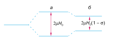 Эффект экранирования заключается в уменьшении расстояния между уровнями ядерной магнитной энергии или, другими словами, приводит к сближению зеемановских уровней (рис.7). При этом кванты энергии, вызывающие переходы между уровнями, становятся меньше и, следовательно, резонанс наступает при меньших частотах (см. выражение (3.4)). Если проводить эксперимент, изменяя поле