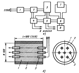 1 - стальной образец; 2 - цилиндр из изолирующего материала (стекла или керамики); 3 - датчики (7 шт.) для измерения параметров