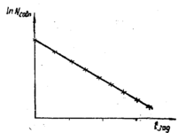 Линия задержки должна включаться именно в тот канал, в котором регистрируется квант 1, так как он испускается раньше кванта 2. В результате эксперимента строится полулогарифмический график зависимости числа тройных совпадений от времени задержки (рис.9), и уже по нему определяется время жизни возбужденного уровня I (так же, как это делается при определении периода полураспада с помощью одиночного детектора).