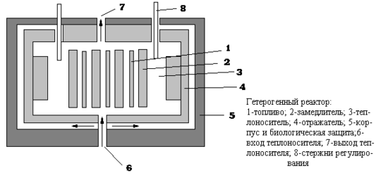 В гетерогенном реакторе топливо в виде блоков размещено в замедлителе, т.е. топливо и замедлитель пространственно разделены.